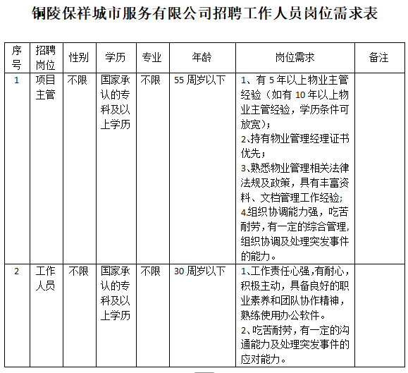 因業(yè)務(wù)發(fā)展需要,銅陵保祥城市服務(wù)有限公司面向社會公開招聘工作人員2名。具體事項公告如下:
